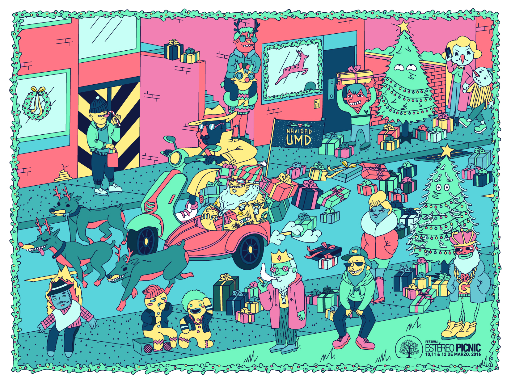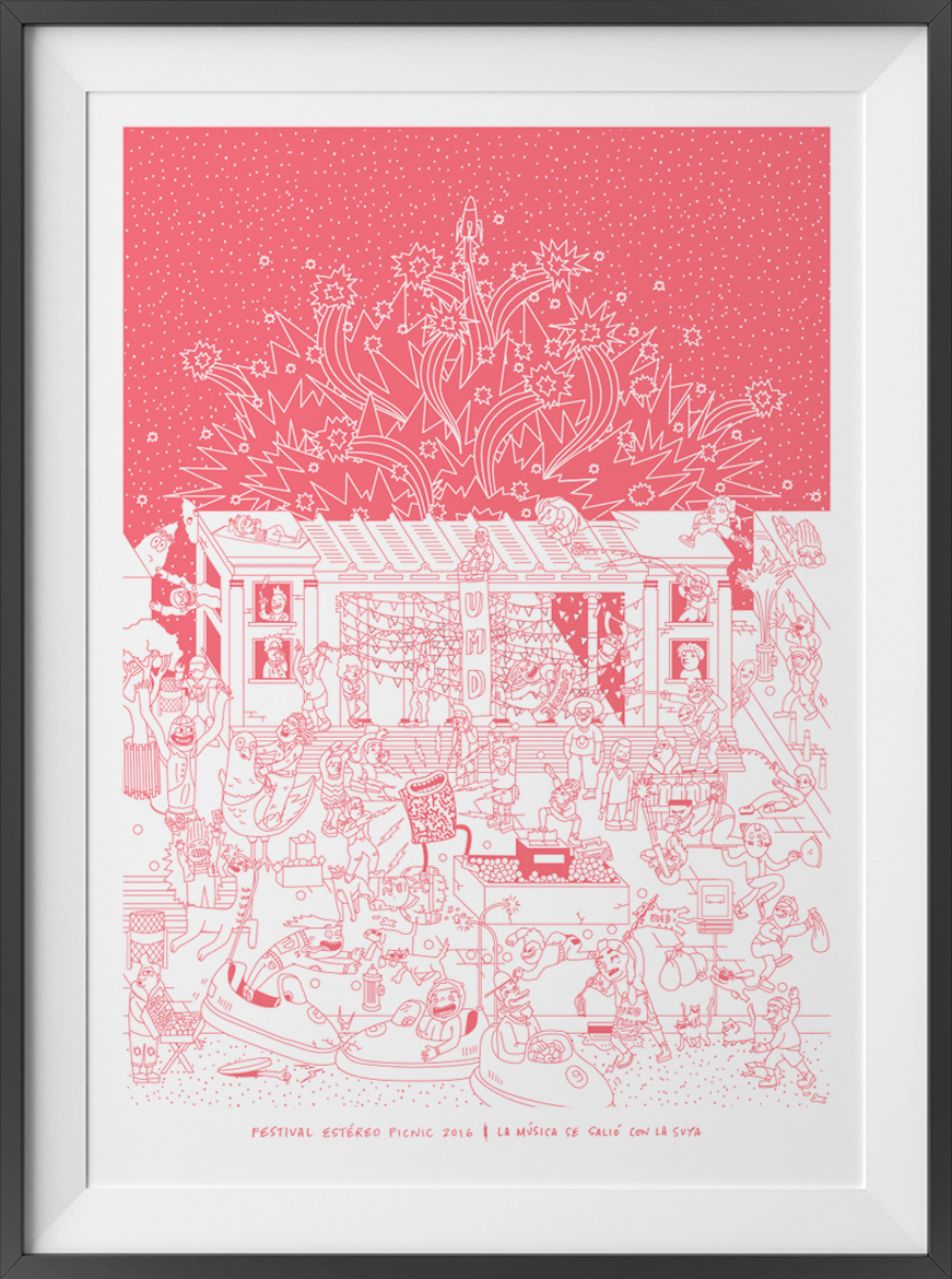“Festival Estéreo Picnic is created and experienced by its assistants. These unique characters are the true creators of the physical and emotional adventures that occur in the Festival. They redimension the festival space, they make music become timeless. We told the story of these people, the crazy citizens of an unnamed city that fought fiercely until the music was restored, overturning the crazy silent regime of the city’s dictator. Utilizing different graphic media like comic strips, lineup animated video, animated gifs, four edition silkscreens, t-shirts, and pins, this year’s communication became one of the most important and remembered ad’s in the Festival history, winning the Premio Lapiz de Acero, the most important design award in Colombia.”